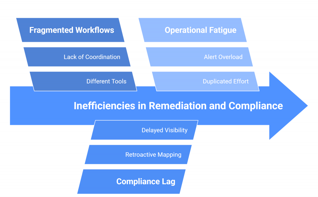 Security teams already face alert overload and must filter through noise to identify the most pressing threats. When remediation and compliance activities are not coordinated, analysts end up duplicating effort—resolving incidents once for security purposes, and then again to produce compliance evidence. This duplication not only drains resources but also contributes to burnout and reduced overall effectiveness.