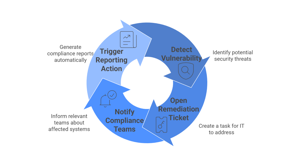 This coordination accelerates response, reduces human error, and ensures compliance validation happens in parallel with remediation rather than as an afterthought.