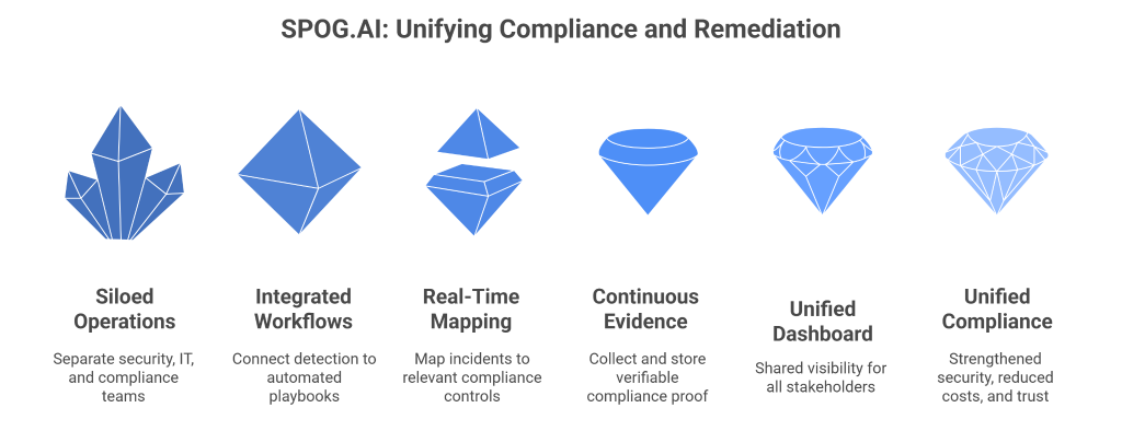 By embedding compliance into remediation workflows, SPOG.AI not only strengthens security posture but also reduces operational costs and audit fatigue. Organizations can demonstrate regulatory adherence during every incident, building resilience and trust with customers, partners, and regulators—all from a single platform.